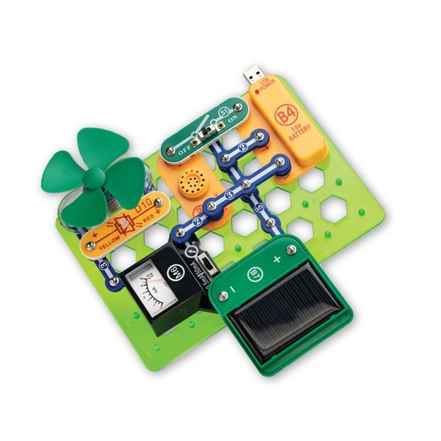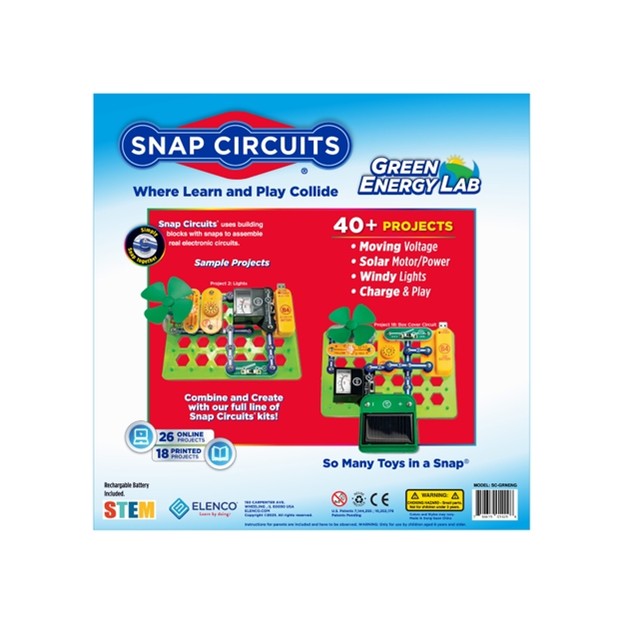 SNAP CIRCUITS Green Energy Lab teaches modern energy conservation in a fun and hands-on way. Learn about clean energy concepts like alternative power including, solar, wind and hydro. Build 44 exciting STEM based projects using the color-coded instruction manual with step-by-step directions. Includes separate “Think Green” educational manual that explains environmentally-friendly energies including geothermal, hydrogen fuel cells, wind, solar, tidal, hydro, and others.
